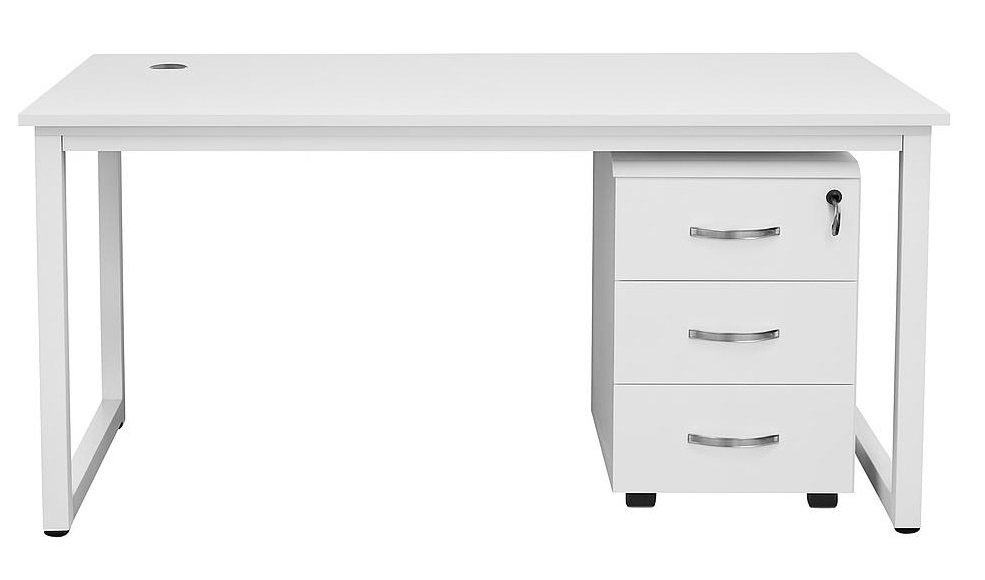 🖥️ משטח עבודה – לוח מלמין לבן רחב ונקי, עם פתח ניהול כבלים 🔩 רגליים – מסגרת מתכת בצבע לבן בעיצוב O-leg מודרני 🗄️ ארגז מגירות – 3 מגירות עם ידיות כסף ומנעול מפתח 🛞 גלגלים – ניידות קלה לארגז המגירות 🎨 צבע – לבן מלא (שולחן + רגליים + מגירות)